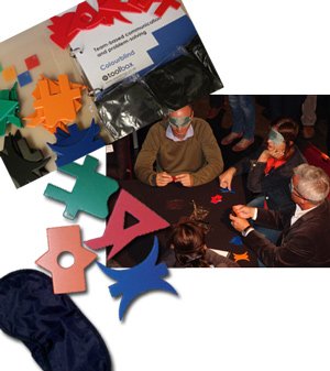 Wearing blindfolds to ensure total dependence upon the quality of their verbal communication, and holding a collection of small, irregular, coloured plastic shapes, a group works together to gather information that will allow them to solve a puzzle.